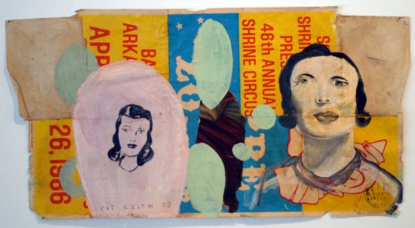 The one piece that stands more apart than the rest is Sarasota, Florida. Keith spent her youth in Sarasota, the home of Ringling Brothers Circus. The circus influence is evident in the vivid sign on which she painted: an old circus announcement with a clown and beautiful combination of red, blue, and yellow background. This piece is also different in that it features two portraits.